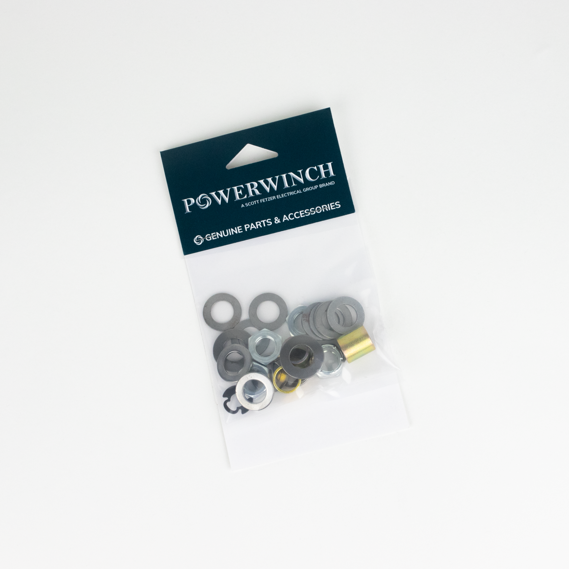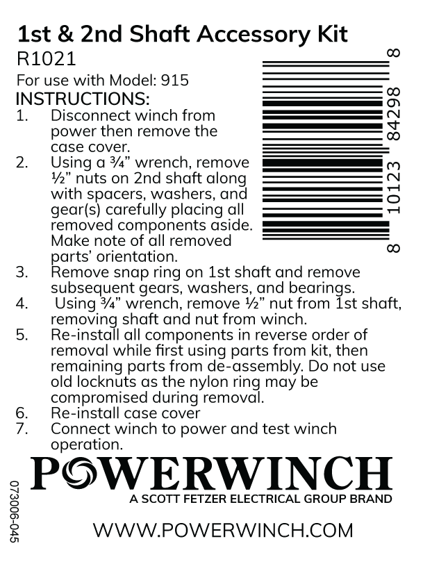 This selection comes with a hex nut, a thrust washer, a retaining ring, 3 different sized hex nuts 1/2-20, 11 washers, 2 different sized spacers, 2 spring washers, and a clutch spacer. The 1st/2nd Shaft Accessory Kit is used in the 915 trailer winch. The kit can be found in the 915 trailer winch manual in the Illustrated Parts List section here.
