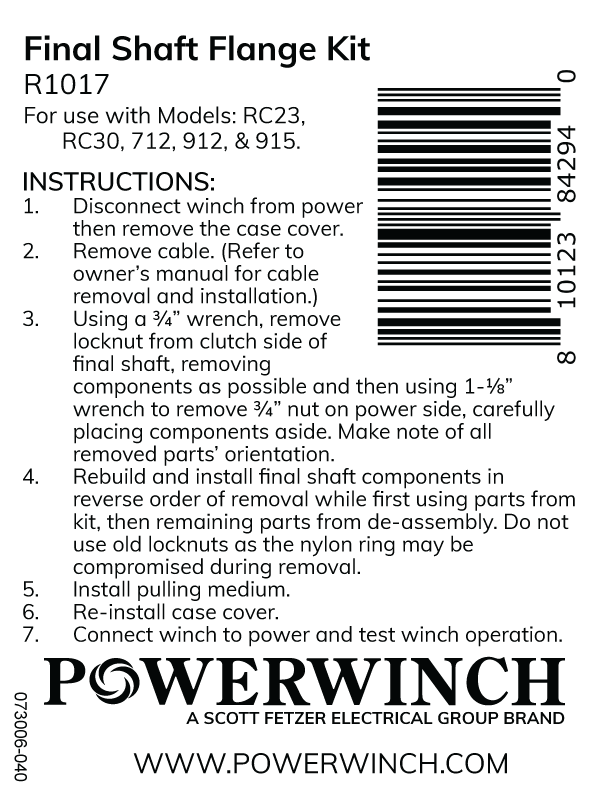 This selection comes with a solid flange, split flange, and lock nut. The Final Shaft Flange Kit is used in the RC23, RC30, 712, 912, and 915 trailer winches. The kit can be found in the Trailer Winch manual here.