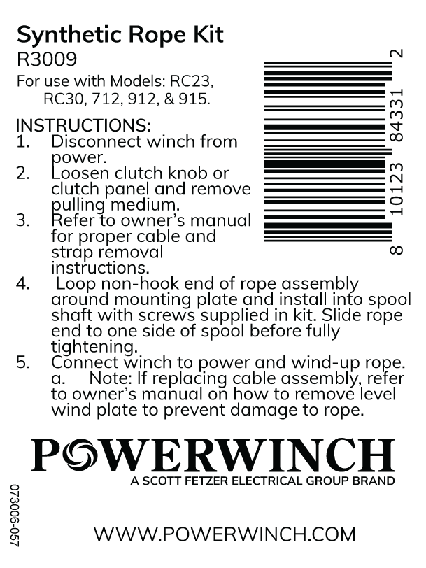 This selection comes with the synthetic rope, a strap plate, 2 screws, and 2 washers. The Synthetic Rope is used in the RC23, RC30, 712, 912, and 915 trailer winches.